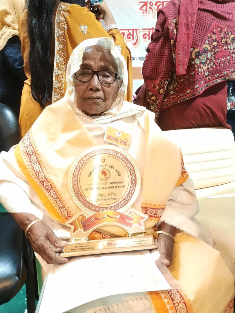 দিনাজপুর শহরের বালুবাড়ী নিবাসী বীর মুক্তিযোদ্ধা আলহাজ্ব মোহাম্মদ হুমায়ুন কবিরের স্ত্রী ৮৬ বছর বয়সী নুরবানু কবীর রংপুর বিভাগীয় পর্যায়ে ‘অদম্য নারী’ পুরস্কার লাভ করেছেন।