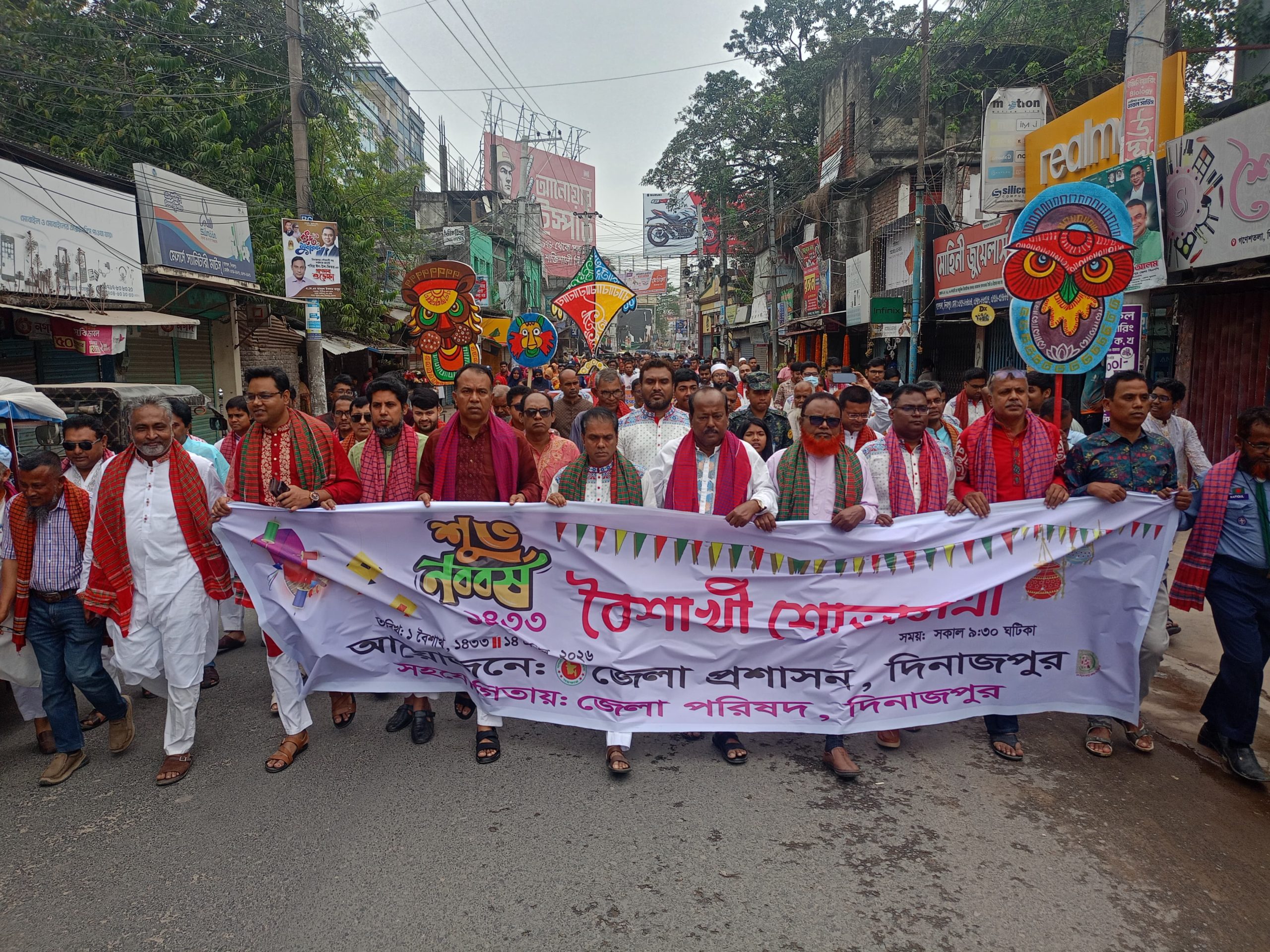 সকাল আটটায় দিনাজপুর একাডেমি স্কুল মাঠ থেকে শুরু হওয়া বৈশাখী শোভাযাত্রা ধীরে ধীরে রূপ নেয় মানুষের ঢেউয়ে। ঢাকের প্রতিটি আওয়াজ যেন হৃদস্পন্দনের মতো বাজে, আর সেই তালে তালে শিশু, তরুণ, বৃদ্ধ—সবাই মিশে যায় এক অখণ্ড স্রোতে। শহরের পথঘাট পেরিয়ে শোভাযাত্রাটি যখন গড়ের শহীদ বড় মাঠে এসে থামে, তখন মনে হয়—এ যেন কোনো যাত্রার শেষ নয়, বরং এক অনন্ত যাপনের শুরু।