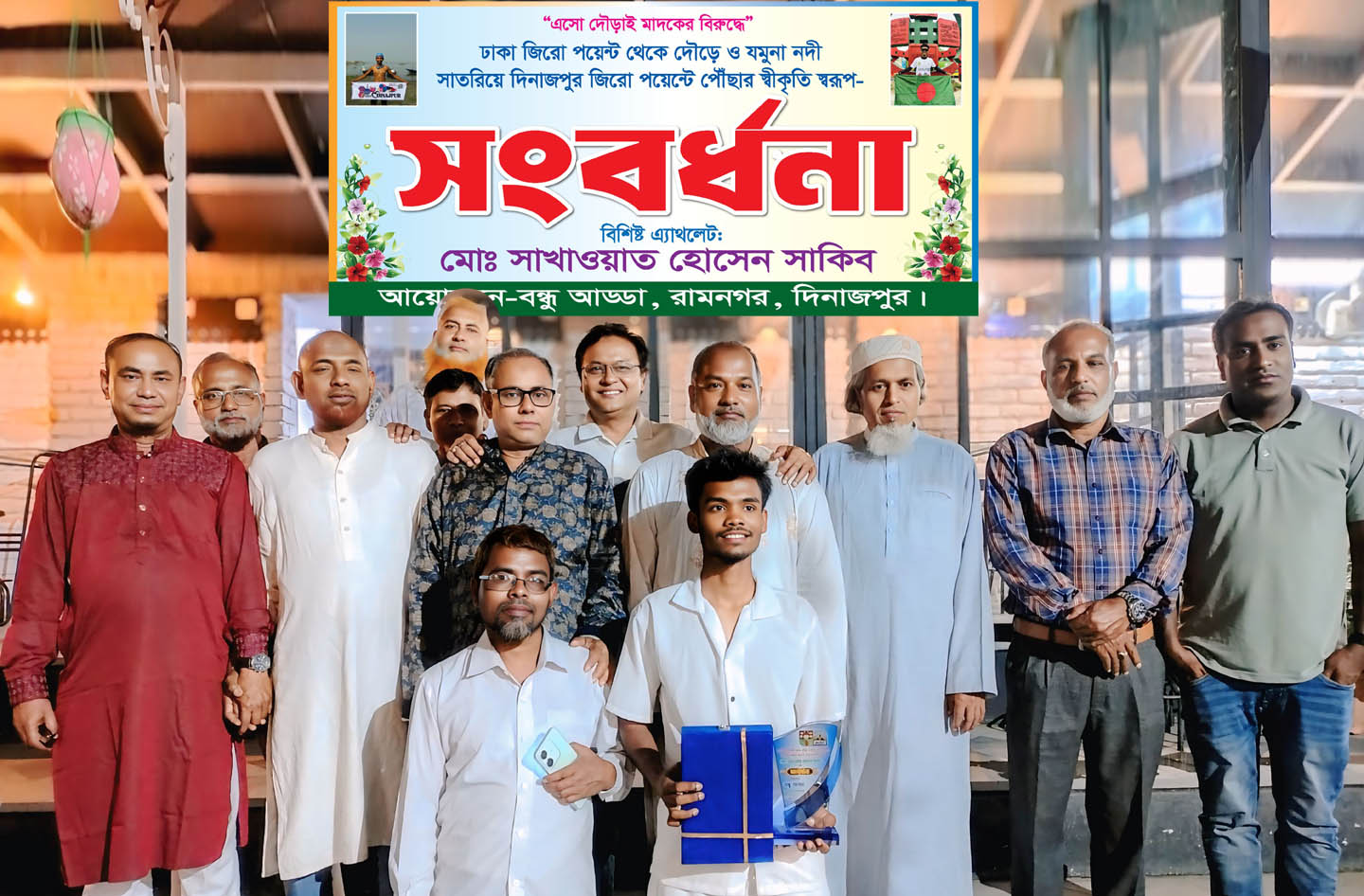 ঢাকা জিরো পয়েন্ট থেকে দৌড়ে ও যমুনা নদী সাঁতরিয়ে দিনাজপুর জিরো পয়েন্টে পৌছার স্বীকৃতি স্বরূপ বিশিষ্ট অ্যাথলেট মো. সাখাওয়াত হোসেন সাকিব কে সংবর্ধনা দিলো সামাজিক সংগঠন “বন্ধু আড্ডা”।